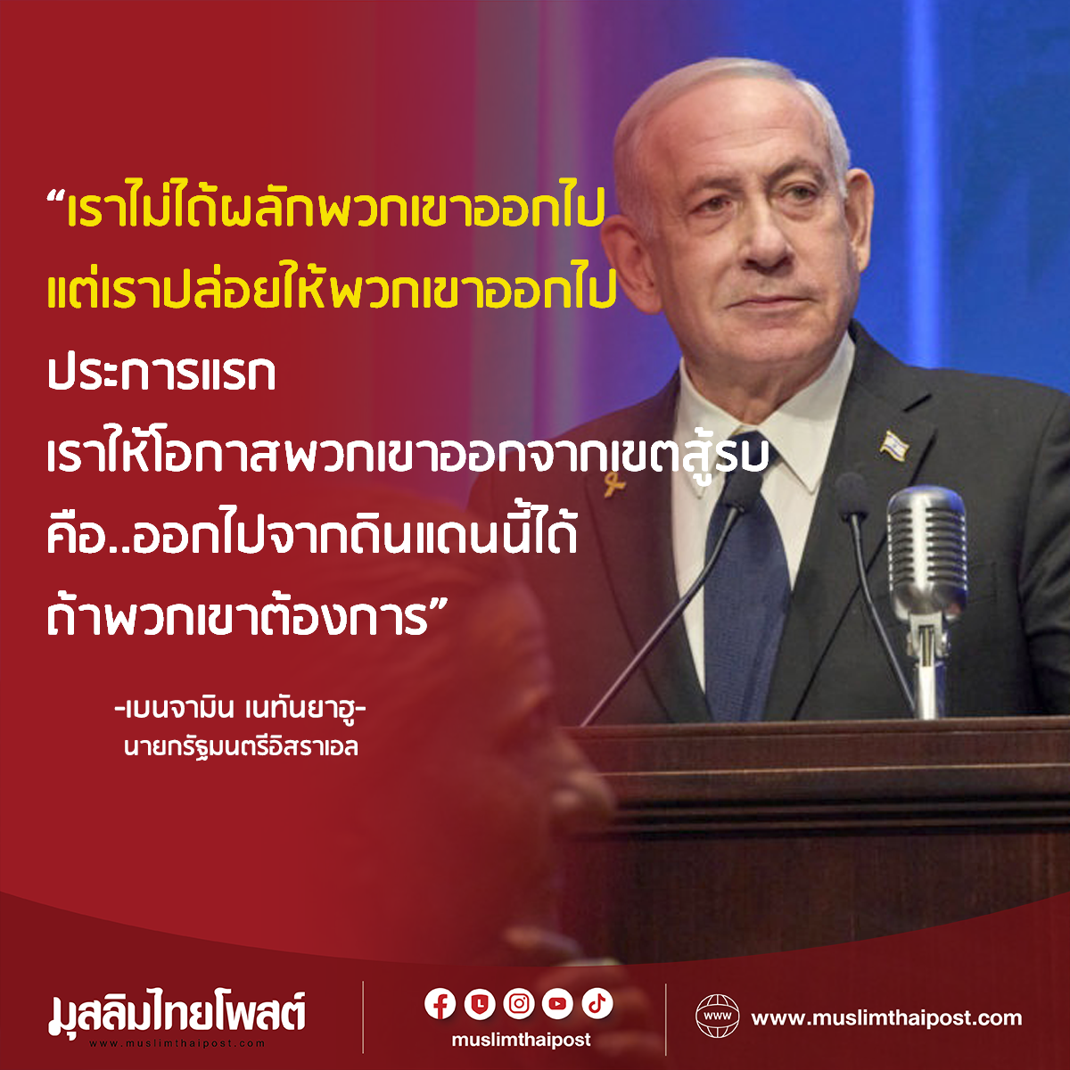 สำนักข่าวมุสลิมไทยโพสต์: เนทันยาฮูเปิดทาง! ให้ชาวปาเลสไตน์ออกจากกาซาได้ 'ถ้าอยากไป'