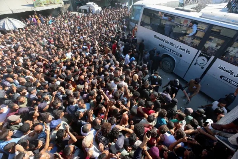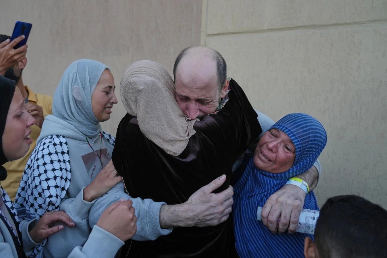 ที่หน้าโรงพยาบาลนัสเซอร์ เจ้าหน้าที่ในชุดลายพรางและสวมหน้ากากพยายามควบคุมฝูงชน ขณะที่อดีตนักโทษในชุดสีเทาของกรมราชทัณฑ์อิสราเอลทยอยลงจากรถบัส เสียงเพลงปลุกใจดังขึ้นพร้อมธงชาติปาเลสไตน์ ธงของกลุ่มฮามาส และแนวร่วมปลดปล่อยปาเลสไตน์ (PFLP) โบกสะบัดอยู่ทั่วบริเวณ