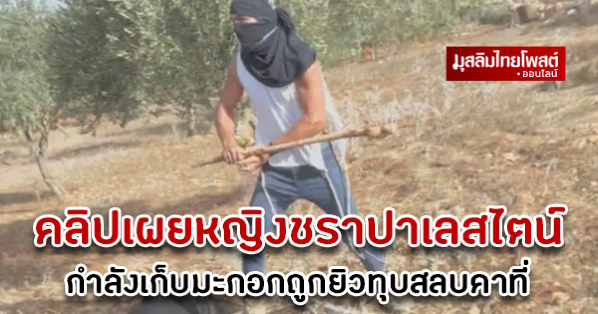 ผู้ตั้งถิ่นฐานชาวอิสราเอล ที่ปิดหน้าตา ใช้ไม้ตีหญิงชราชาวปาเลสไตน์จนสลบคาที่ ขณะที่เธอกำลังเก็บผลมะกอกในที่ดินของตัวเอง