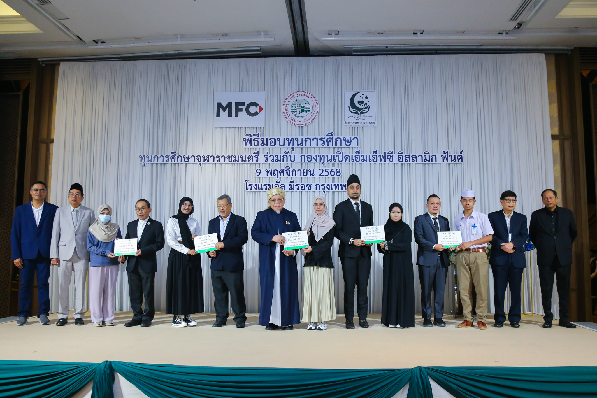 ในวันที่ 9 พฤศจิกายน 2568 ณ โรงแรมอัลมีรอซ ถนนรามคำแหง กรุงเทพมหานคร นายอรุณ บุญชม จุฬาราชมนตรี ให้เกียรติเป็นประธานในพิธีมอบ “ทุนการศึกษาจุฬาราชมนตรีร่วมกับกองทุนเปิด MFC Islamic Fund” ประจำปี 2568 จำนวน 56 ทุน แก่นักศึกษาจากทั่วประเทศที่ผ่านการคัดเลือก โดยมี นายธนโชติ รุ่งสิทธิวัฒน์ กรรมการผู้จัดการ บริษัทหลักทรัพย์จัดการกองทุน เอ็มเอฟซี จำกัด (มหาชน), ดร.นพดล เต๊ะหมาน ประธานคณะทำงานทุนจุฬาราชมนตรีร่วมกับกองทุนเปิด เอ็มเอฟซี อิสลามิก ฟันด์, พล.ต.ต.สุรินทร์ ปาลาเร่ เลขาธิการคณะกรรมการกลางอิสลามแห่งประเทศไทย, ผศ.ดร.อาแว มะแส ประธานคณะอนุกรรมการพิจารณาคัดเลือก, รศ.ดร.ปกรณ์ ปรียากร ผู้ทรงคุณวุฒิจุฬาราชมนตรี พร้อมด้วยคณะกรรมการโครงการ และแขกผู้มีเกียรติร่วมในพิธี