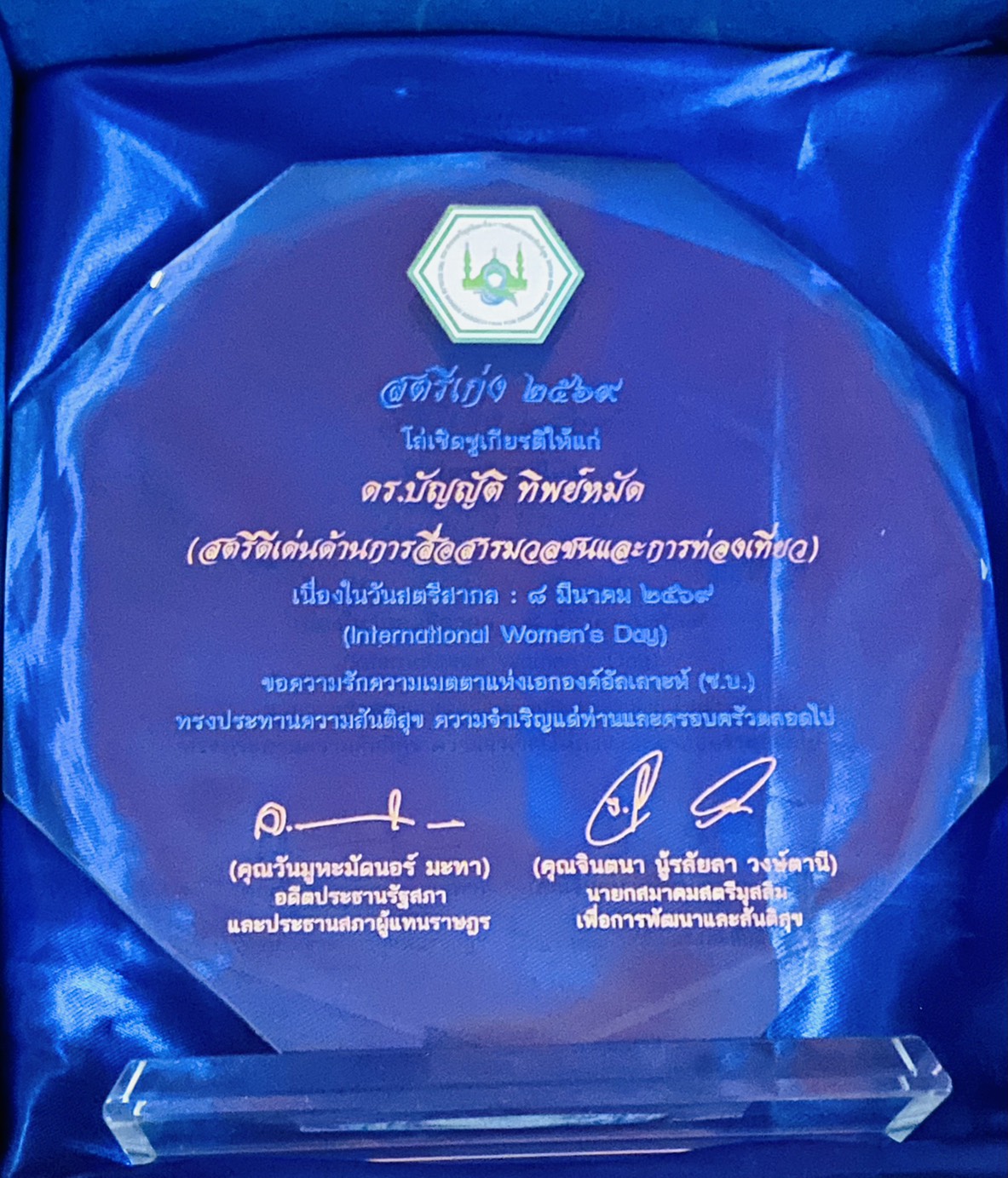 เมื่อวันเสาร์ที่ 28 มีนาคม 2569 ณ ห้องอาหารโซเฟีย รามคำแหง กรุงเทพมหานคร เนื่องในวันสตรีสากล สมาคมสตรีมุสลิมเพื่อการพัฒนาและสันติสุข ได้จัดงานแสดงความยินดีและมอบโล่ “สตรีเก่ง 2569” เพื่อเชิดชูเกียรติบุคคลที่อุทิศตนทำงานช่วยเหลือสังคมอย่างต่อเนื่อง