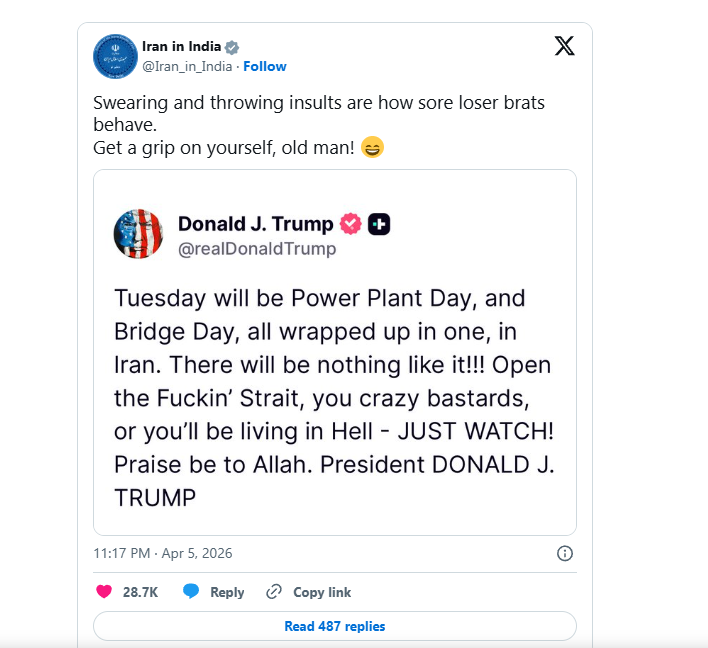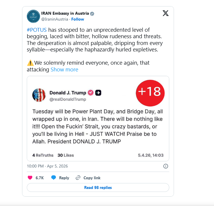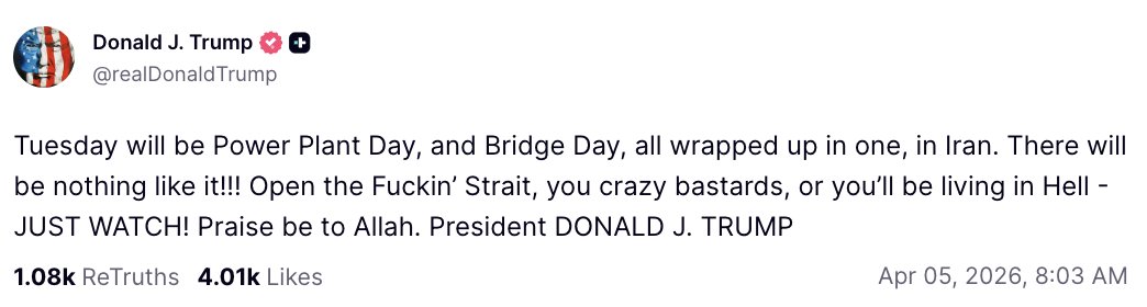 ทรัมป์ระบุในข้อความด้วยถ้อยคำหยาบคายและรุนแรงว่า “วันอังคารนี้จะเป็น ‘วันแห่งโรงไฟฟ้า’ และ ‘วันแห่งสะพาน’ รวมกันเป็นวันเดียวในอิหร่าน มันจะเป็นเหตุการณ์ที่ไม่เคยมีอะไรเทียบได้!!! เปิดไอ้ช่องแคบเฮงซวยนั่นซะ พวกสารเลวสติไม่ดี ไม่อย่างนั้นพวกแกจะได้ไปอยู่ในนรก — คอยดูให้ดี! ขอสรรเสริญอัลลอฮ์ ประธานาธิบดี โดนัลด์ เจ. ทรัมป์”