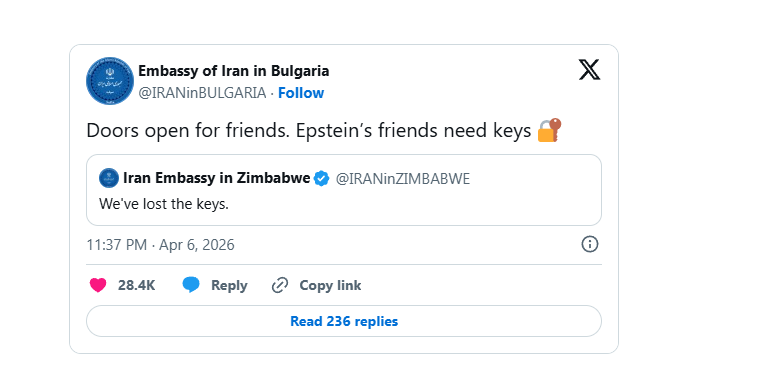 มุก "กุญแจหาย": สถานทูตอิหร่านประจำซิมบับเว โพสต์ตอบโต้คำสั่งให้เปิดช่องแคบแบบกวนๆ ว่า "เราทำกุญแจหาย" ขณะที่สถานทูตในแอฟริกาใต้ช่วยรับมุกว่า "ชู่ววว... กุญแจอยู่ใต้กระถางต้นไม้ เปิดให้เฉพาะเพื่อนนะ"