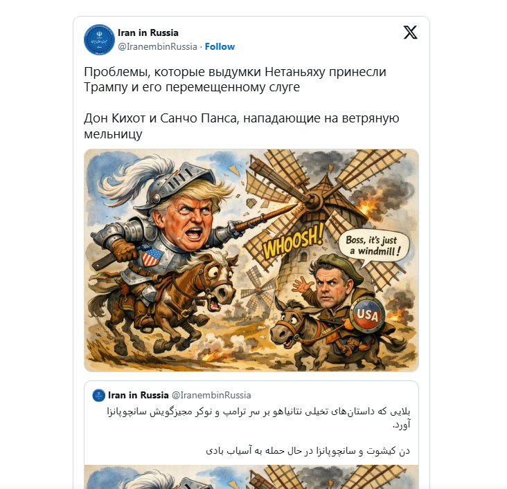 นอกจากนี้ สถานทูตอิหร่านในรัสเซียและเยอรมนี ยังได้แชร์ภาพการ์ตูนล้อเลียนเปรียบทรัมป์เป็น "ดอน กิโฆเต้" ผู้เพ้อฝัน และเรียกร้องให้เจ้าหน้าที่สหรัฐฯ พิจารณารัฐธรรมนูญแก้ไขเพิ่มเติมฉบับที่ 25 มาตรา 4 ว่าด้วยการถอดถอนประธานาธิบดีที่ไม่เหมาะสมต่อการปฏิบัติหน้าที่