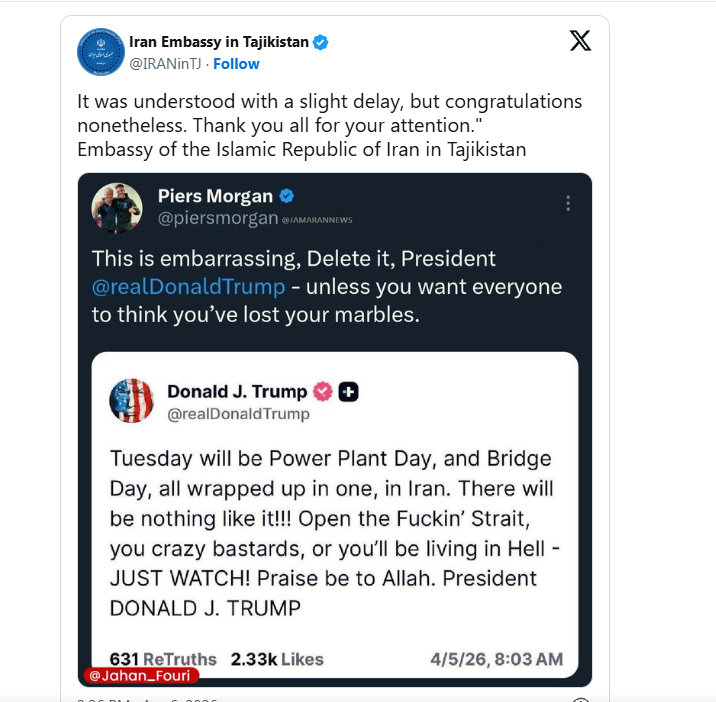 เตือนภัย "18+": สถานทูตอิหร่านประจำออสเตรีย นำภาพโพสต์ของทรัมป์มาคาดแถบตัวอักษร "18+" พร้อมเตือนผู้ปกครองให้กันเด็กต่ำกว่า 18 ปีออกจากการรับฟังวาทกรรมที่หยาบคาย และย้ำว่าการขู่โจมตีโครงสร้างพื้นฐานพลเรือนถือเป็น "อาชญากรรมสงคราม"